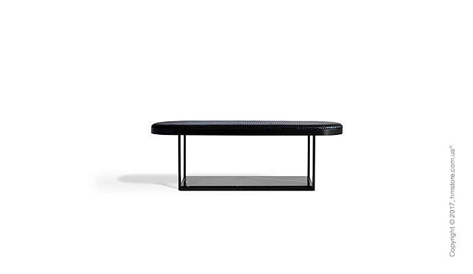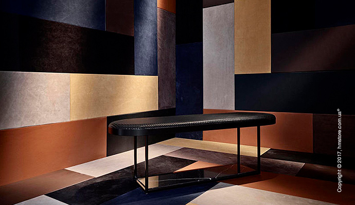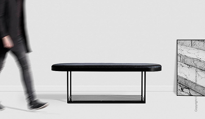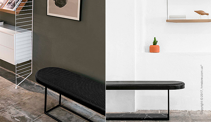 Скамейка «HOLA» служит «гостеприимным» предметом мебели для дома и офиса («hola» в испанском означает «привет»). В ней сочетается целое разнообразие контрастов – прямые и закругленные детали, мягкость и твердость. Сиденье имеет плетеную обивку из кожи. Оно сидит на стальной структуре, в основании которой находится отполированная до блеска полочка из черного мрамора.