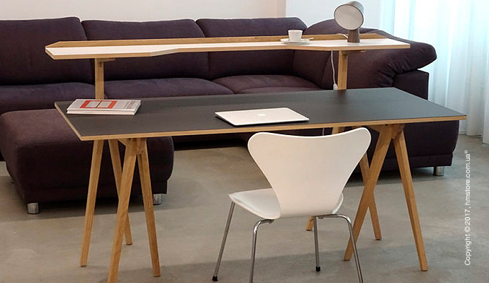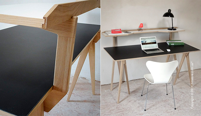Спина «животного» служит опорой для основной столешницы, а «голова» позволяет установить сверху еще и удобную полочку.