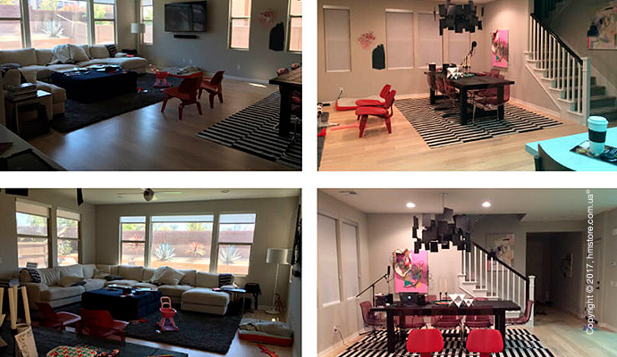 Еще несколько лет назад в гостиной были установлены жалюзи «Hunter Douglas Designer Roller Shades» от «Decorview». При обновлении было принято решение обратиться к этой же компании, которая предоставила местного дизайнера для бесплатной консультации, в результате чего и были разработаны индивидуальные шторы для всего помещения.