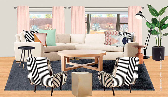 Готовая гостиная отличается скандинавским стилем. Однако скандинавская цветовая гамма и аккуратные линии отлично гармонируют с графическими черно-белыми полосами, современной люстрой и «фермерским» столом. В целом же само помещение отличается просторностью и свежестью.