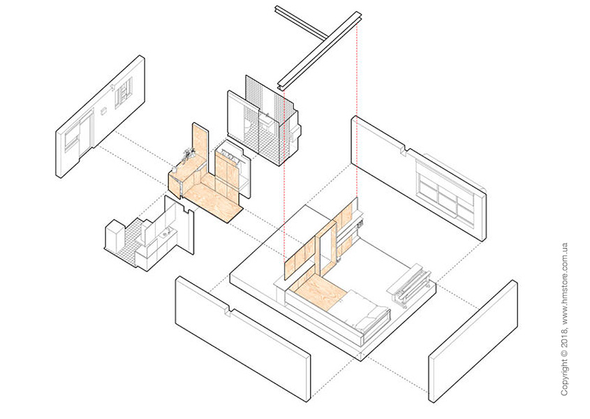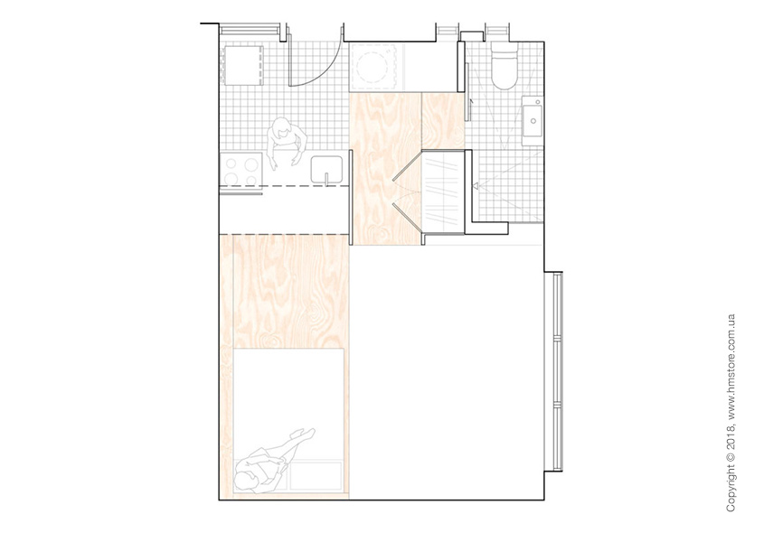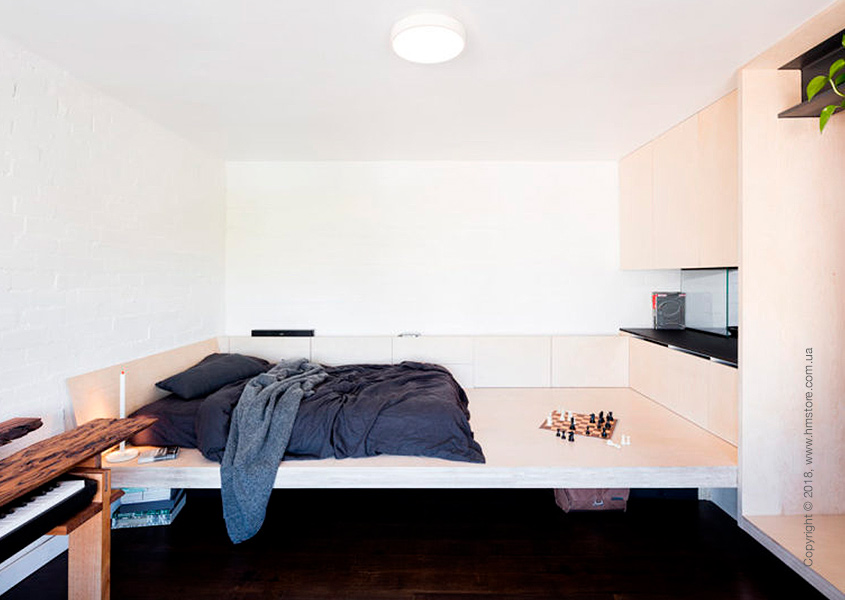 Новая гостиная занимает огромную часть площади. Она отделена от входной двери коридором из деревянных шкафов. Такая же светлая фанера используется в гостиной в виде навесной многофункциональной конструкции, которая может использоваться как зона отдыха для восьми человек и как спальное место (достаточно просто положить сверху матрац). Вокруг конструкции находится множество места для хранения, которое легко можно скрыть, когда оно не используется.