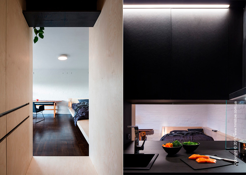 С другой стороны шкафов находится полностью черная и открытая кухня, в которую поступает достаточно света.