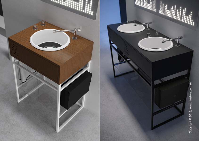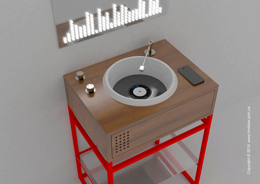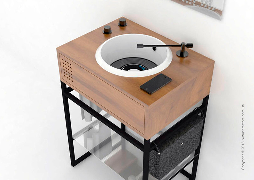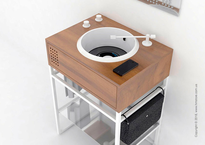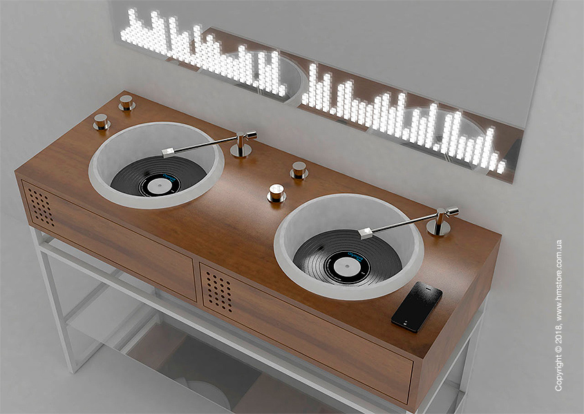 Для более правдоподобно вида кран к этим раковинам выполнен в виде тонарма, а две поворотные головки, напоминающие регуляторы звука, используются для регулировки напора и температуры воды.