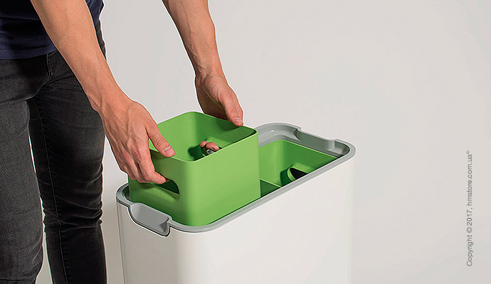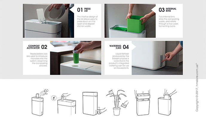 Процесс бокаши создает жидкое удобрение и компост. Жидкость хранится внутри герметичной лейки, которая встроена в само ведро и которая легко достается для полива растений. Система использует два отсека для разделения отходов, и компост в ней создается намного быстрее традиционных уличных методов. Кроме того, двойная крышка и прорезиненное покрытие предотвращает образование запахов снаружи, а специальное покрытие упрощает выбрасывание мусора и чистку ведра.