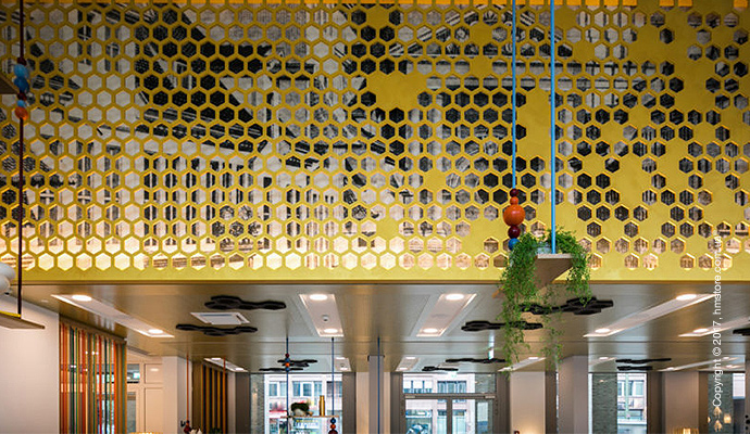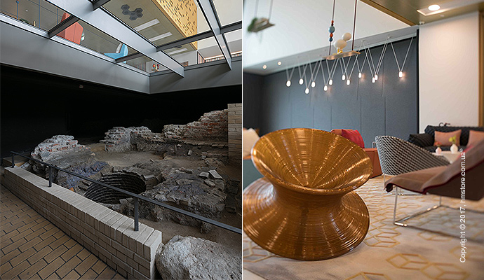 Гостей встречает оригинальная инсталляция из перфорированных шестиугольников, за которыми можно увидеть черно-белую гравюру с рекой и старыми домами. Это – физическая метафора для истории, которая все еще просматривается в современном дизайне. Пол здесь же в фойе стеклянный, и внизу можно увидеть археологические раскопки.