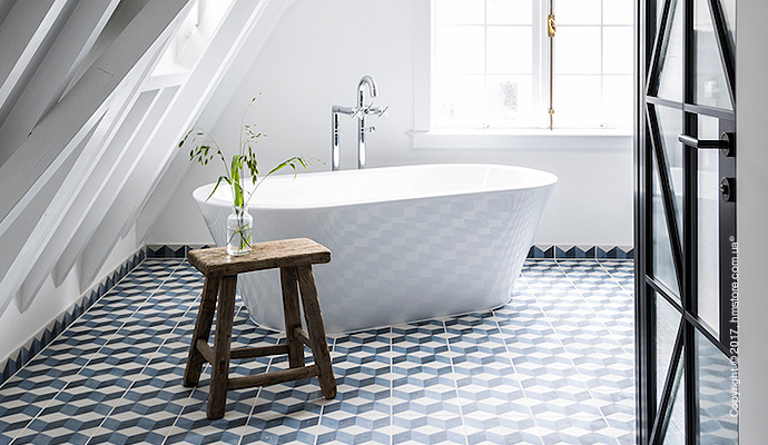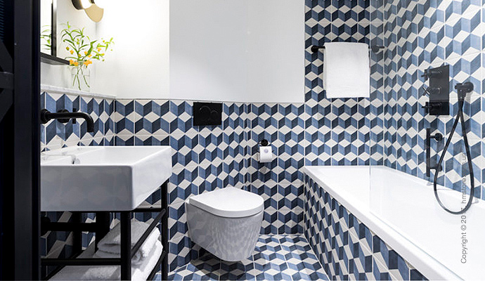 Ванные комнаты имеют геометрическую напольную и настенную плитку. Оборудование в матовом черном цвете, латунные приспособления и встроенный унитаз создают современный вид.