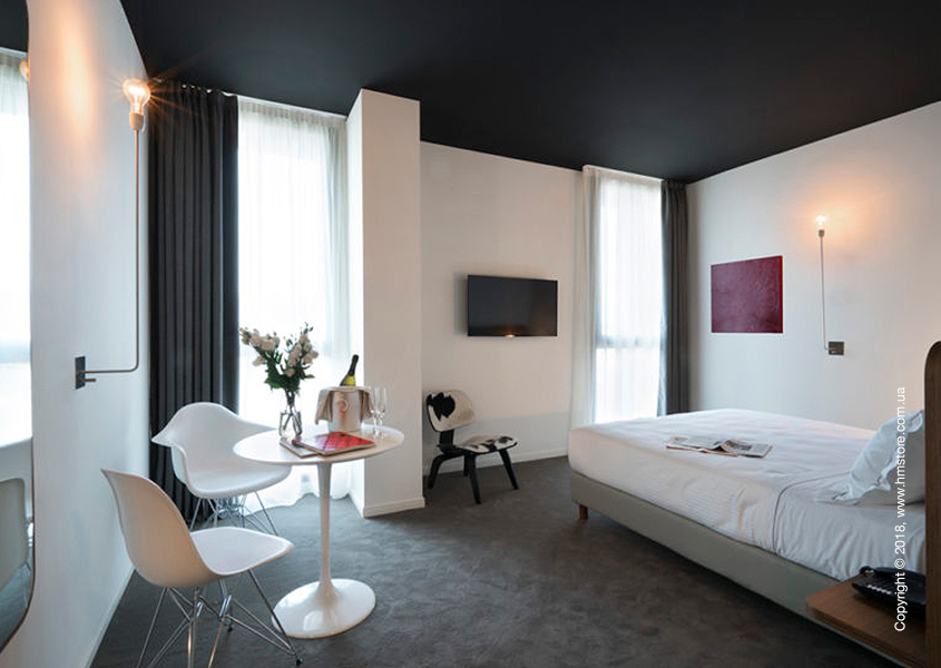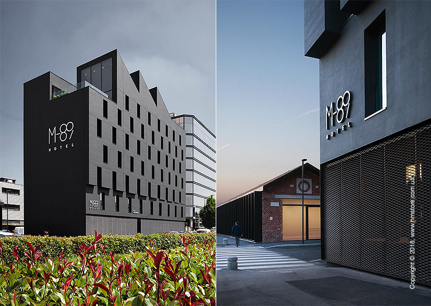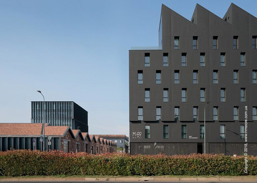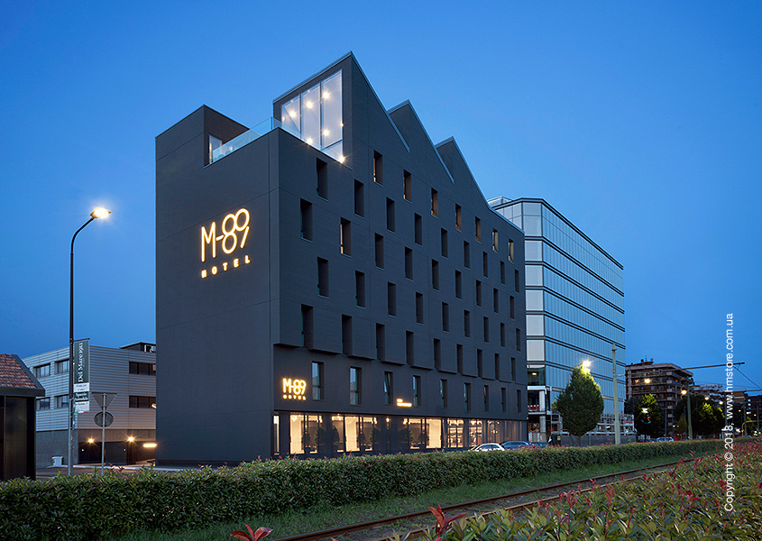 Отель M89 Hotel сразу бросается в глаза из-за своей уникальной структуры крыши. При детальном рассмотрении вы заметите, что его дизайн на самом деле является интерпретацией помещений фабрики, на которую «смотрит» отель. Эти исторические здания когда-то вмещали Caproni, одну из главных итальянских авиакомпаний, а сейчас являются домом для Gucci (также обновленном Piuarch). Структура крыши позволила разместить там террасу с рестораном, отличающуюся панорамными окнами, из которых открываются виды на Милан и его линию горизонта.