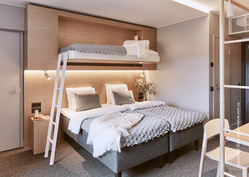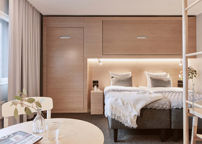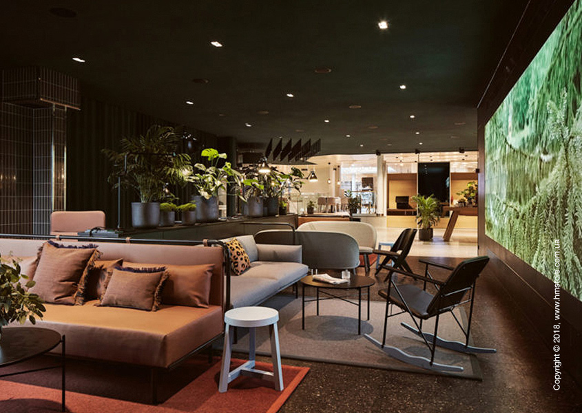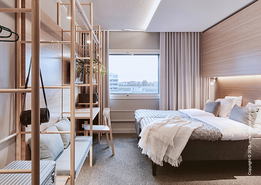 Fyra желали создать уютный и приветливый отель для уставших путешественников, поэтому они наполнили его финскими и скандинавскими дизайнерскими элементами – например, натуральное дерево, большой экран в фойе, на котором показывается природа Финляндии, и, конечно же, много современной мебели, которая делает общие места более привлекательными.
