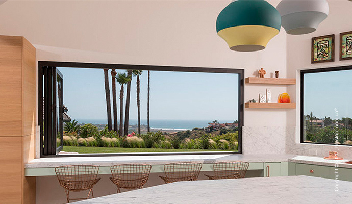 Дом находится возле океана, поэтому из огромных окон с черными рамами, а также через раздвижные стеклянные двери открываются виды на калифорнийские пейзажи и море.