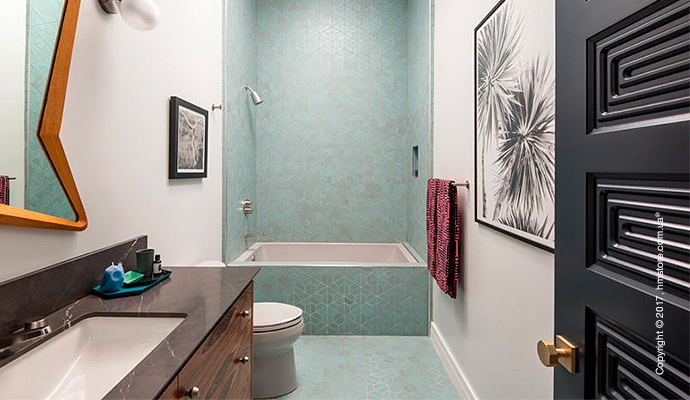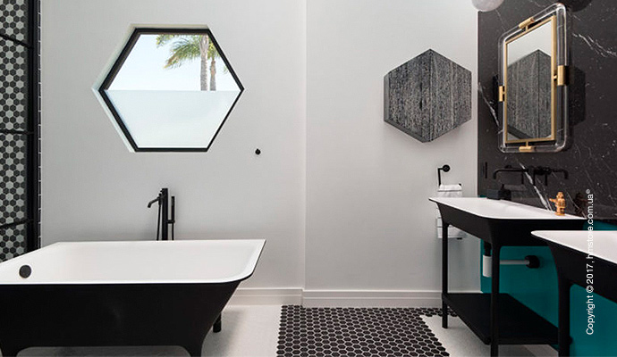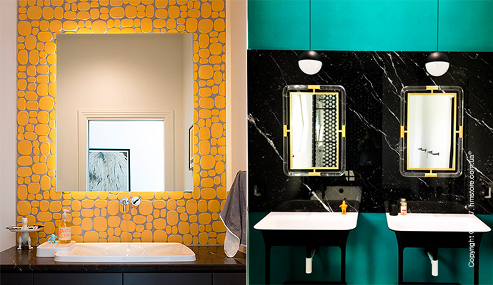 В одной из ванных комнат дизайнеры использовали солнечно-желтую плитку «Rex Ray» от «Modwalls», которая отлично сочетается с темными шкафчиками и мраморной столешницей.