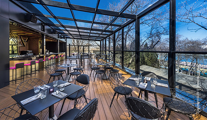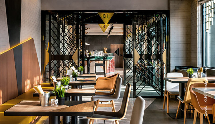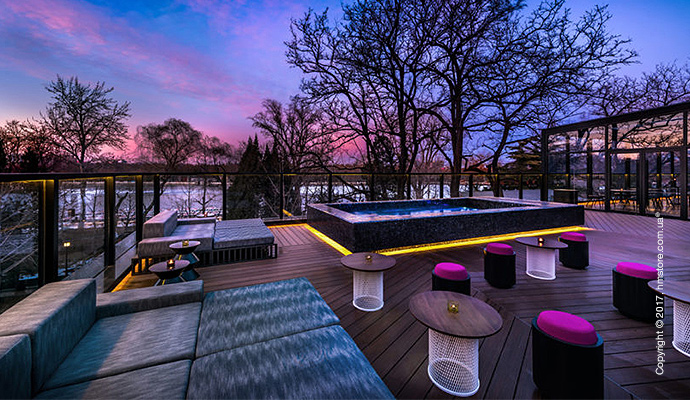 В отеле можно найти множество общих мест и столовых: кафе и булочная «FAB», ресторан «Pink Rabbit» и бар на крыше «Moon Bar», из которого открываются виды на озеро.