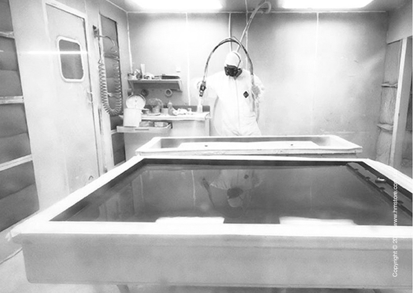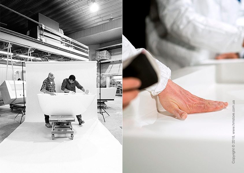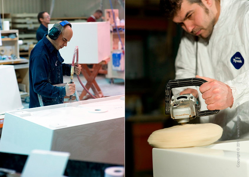 Чистовая обработка. Отделка завершается вручную в течение 4-6 часов с помощью последовательной полировки, в результате которой создается глянцевое (True High Gloss) или матовое («Matte») покрытие.