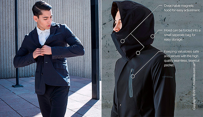 Костюм «Tranzend Suit» доказывает, что мода может быть функциональной. Это – не простой костюм, а костюм, который имеет целый список преимуществ. «Tranzend» полностью водонепроницаем, защищен от УФ излучения, пятен, запаха и складок, дышащий, тянущийся и экологичный. Это то, что можно надеть утром и не снимать до самого вечера.