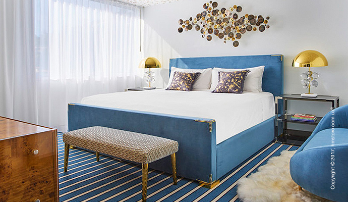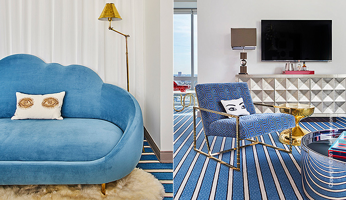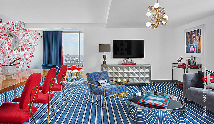 Этот номер отличается графическими узорами (на стенах, полу, произведениях искусства и мебели), металлическими деталями (включая зеркальный журнальный столик, который кажется оптической иллюзией), муралами ручной работы и уникальной мебелью.