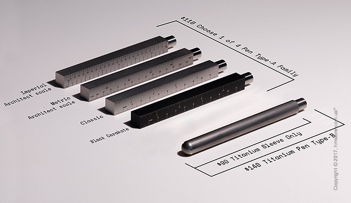 Титановая ручка «Titanium Pen Type-B» является преемником ручки «Type-A» с металлическим корпусом и оригинальной структурой с квадратной линейкой. Титановая версия создавалась как классическая альтернатива «Type-A». Она имеет корпус, выполненный из титана («Type-A» были созданы из нержавеющей стали) с той целью, чтобы стать классической ручкой, которая будет использоваться везде и всегда, веками.