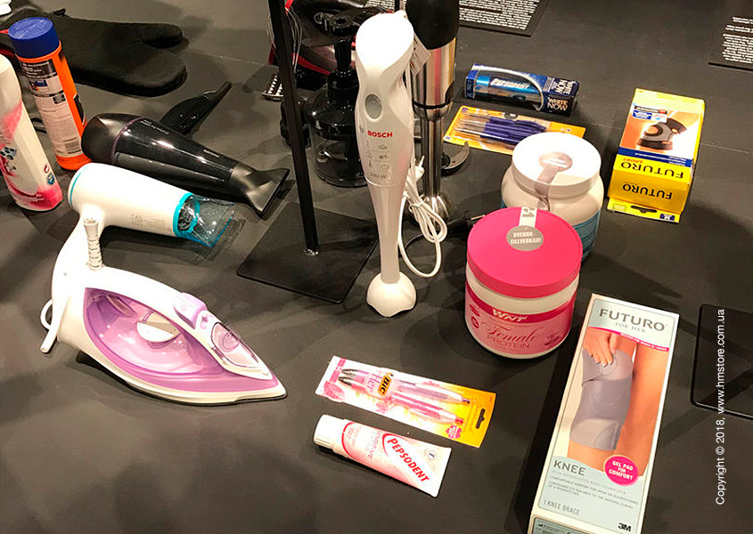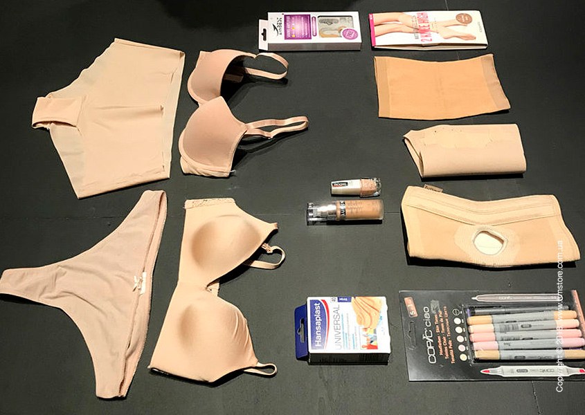 Еще один стенд выставки демонстрирует предметы, которые являются примерами того, как гетеросексуальные, двуполые и «белые» нормы устанавливаются и поддерживаются в нашем физическом окружении. Эта коллекция «телесных» предметов – некоторые даже описываются как «универсальные» – однозначно созданы только для белых людей.