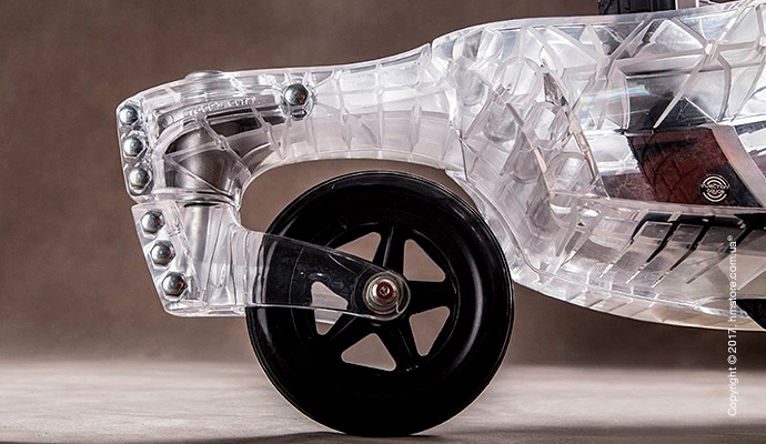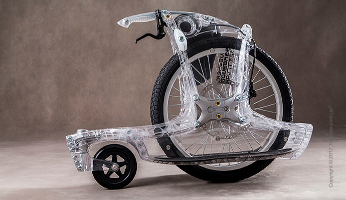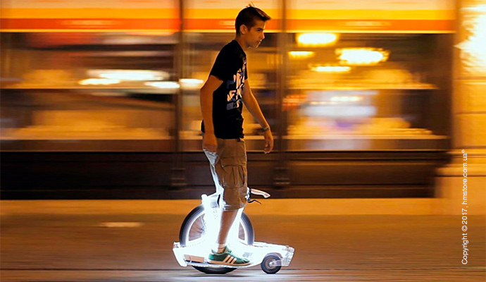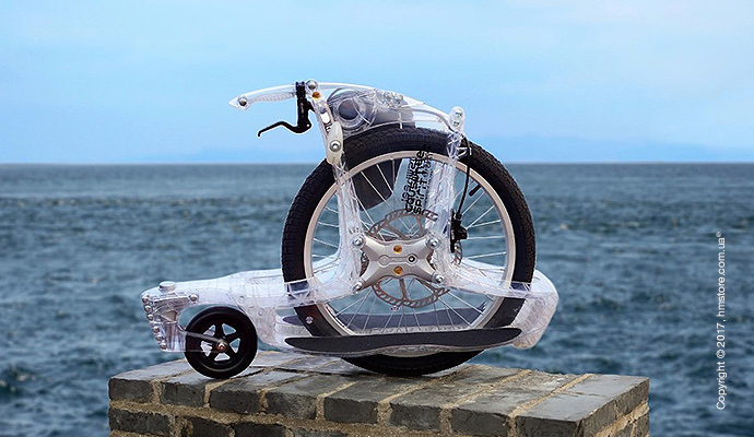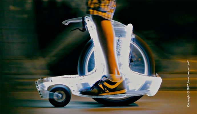 «Gauswheel» создан для передвижения по городу. Он отличается оригинальным расположением колес, при котором большое, 20-дюймовое колесо находится сзади (там, где вы стоите), а маленькое – спереди. Весь корпус выполнен из прозрачного поликарбоната, но есть и непрозрачная версия из ABS-пластика.