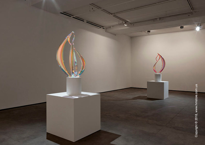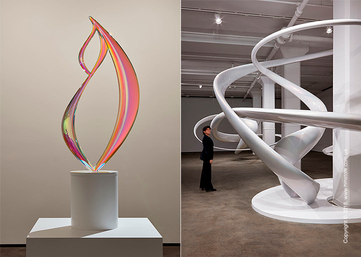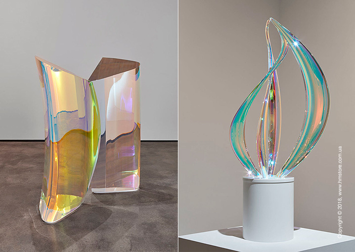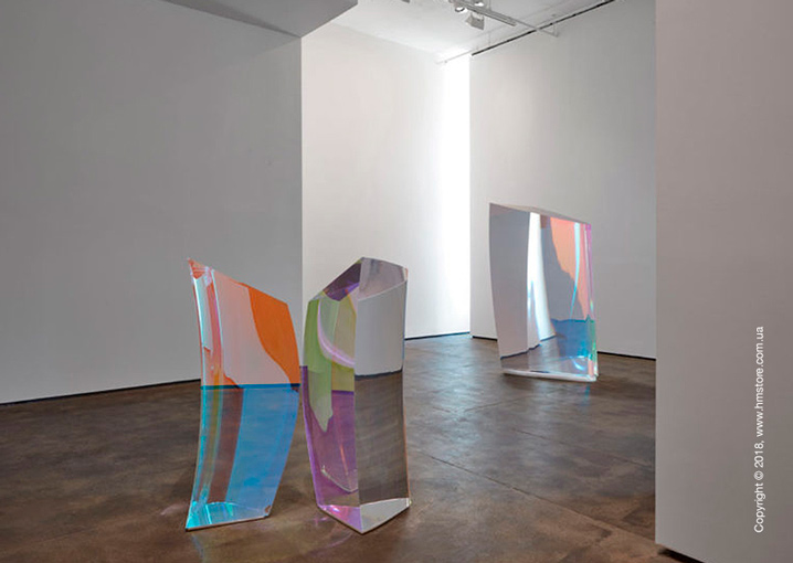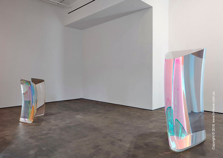 Прозрачные скульптуры в смежном помещении созданы из слоеного акрила с двухцветным покрытием. Такая структура создает неожиданные эффекты. Во-первых, с каждым сделанным шагом можно заметить изменение цвета, а во-вторых, свет переламывается непредсказуемыми способами. И хотя они кажутся прозрачными, через них практически ничего не видно. Они скорее функционируют как голографические зеркала, создавая отражения зрителей или разных частей галереи. Самая большая из этих скульптур – «Plasma Stone I» – имеет высоту около 2 метров.