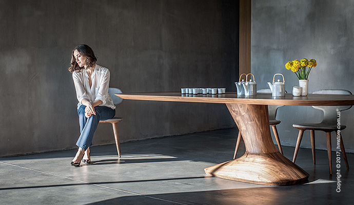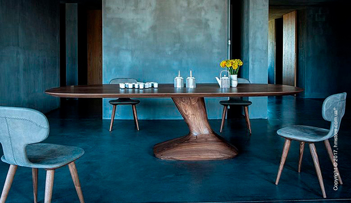 Обеденный стол «SPEED» выполнен из твердого дерева и отличается одной ассиметричной ножкой, которая поддерживает все структуру.