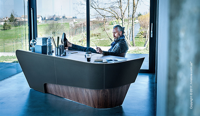 Рабочий стол «KLIP» отличается кожаной обшивкой, которая сразу придает ему смелый вид. Этот стол из твердой древесины имеет три ящичка, открыть которые можно с помощью поперечных пазов вместо традиционных ручек.