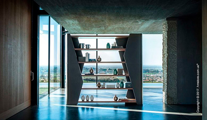 Книжный шкаф «FINESSE» отличается изогнутыми краями, обитыми кожей, а также шестью одинаковыми полками.