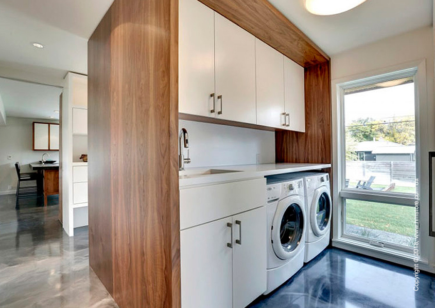 Расположенный в г. Лафейетт (Калифорния) дом от Amber Interiors создавался для семьи, которая потеряла свое предыдущее жилье в пожаре. Компания работала с архитектором Barbara Chambers из Chambers & Chambers для создания современного дизайна для дома, включая и прачечную со стиральной машинкой и сушилкой, которые являются частью шкафчика.