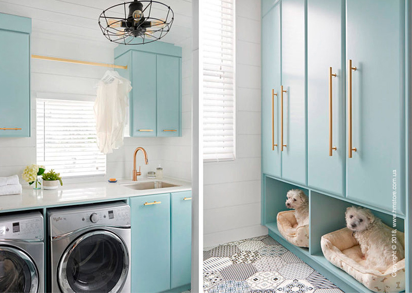 Soda Pop Design создали прачечную с бирюзовыми шкафчиками, благодаря чему помещение выглядит свежим и аккуратным. В качестве фурнитуры была выбрана современная латунь. Все это идеально сочетается с черно-белой плиткой для пола и удобным лежаком для собаки.