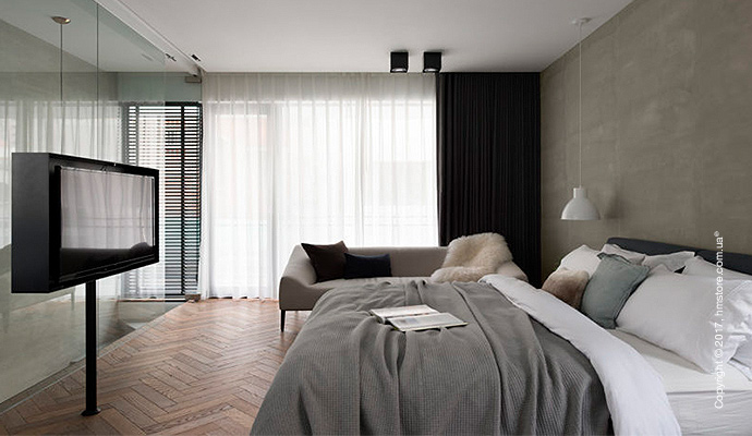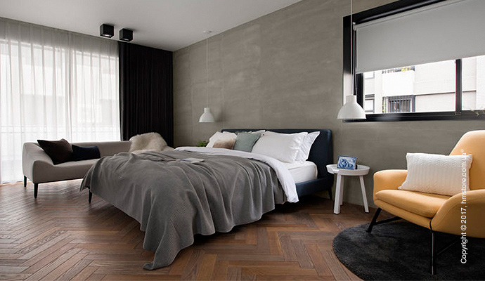 Бетонная лестница ведет к спальне и находится за огромными стеклянными панелями, через которые на нее попадает достаточно света. Немного тепла этой комнате, выполненной в стиле индастриал, добавляет пол, выложенный деревом.