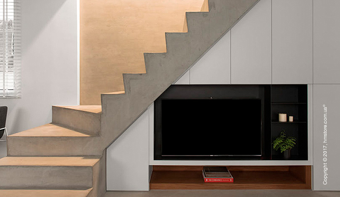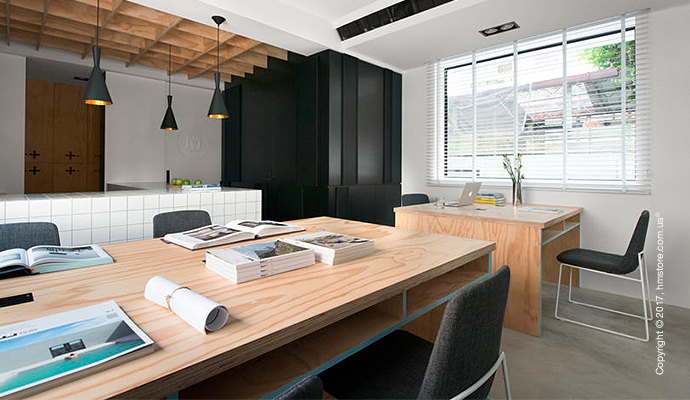 Бетонная лестница является основным акцентом, который ведет на второй этаж. Рабочее помещение с массивными столешницами из сосны предлагает простое и огромное место для работы.