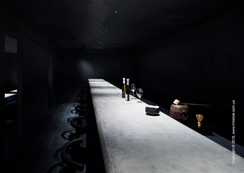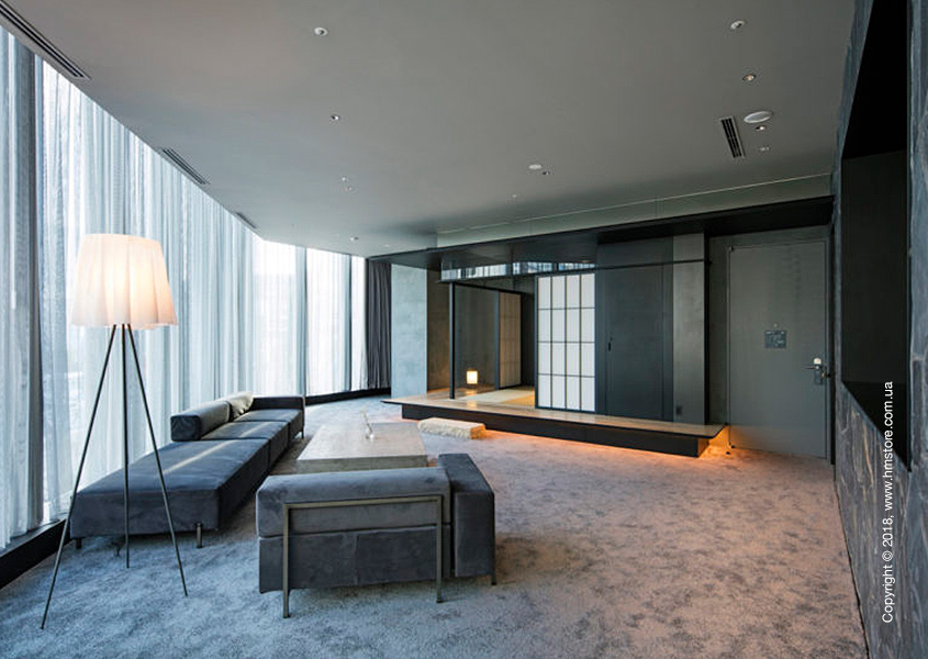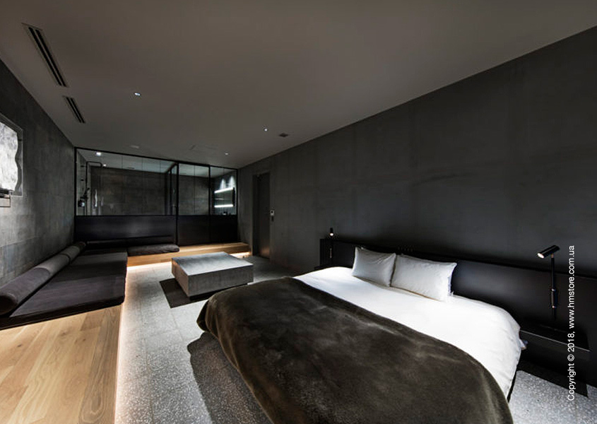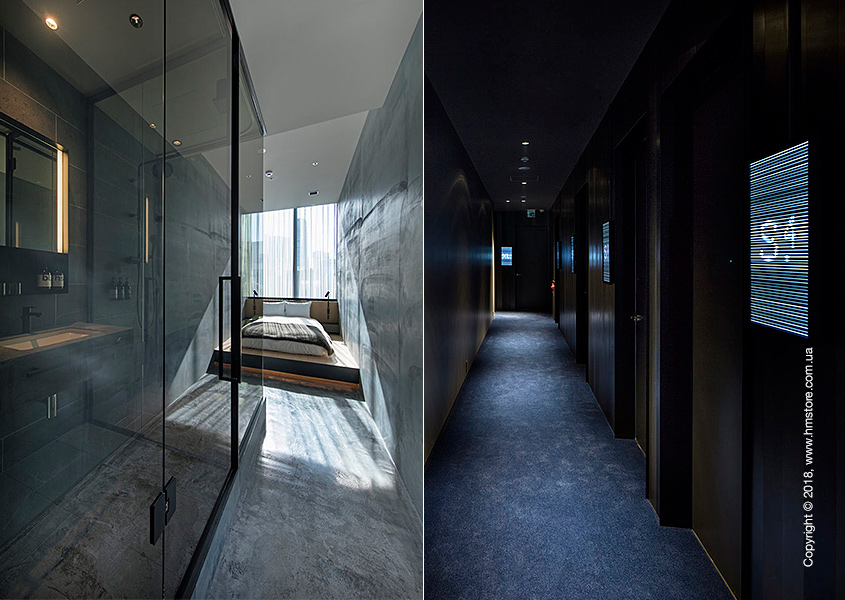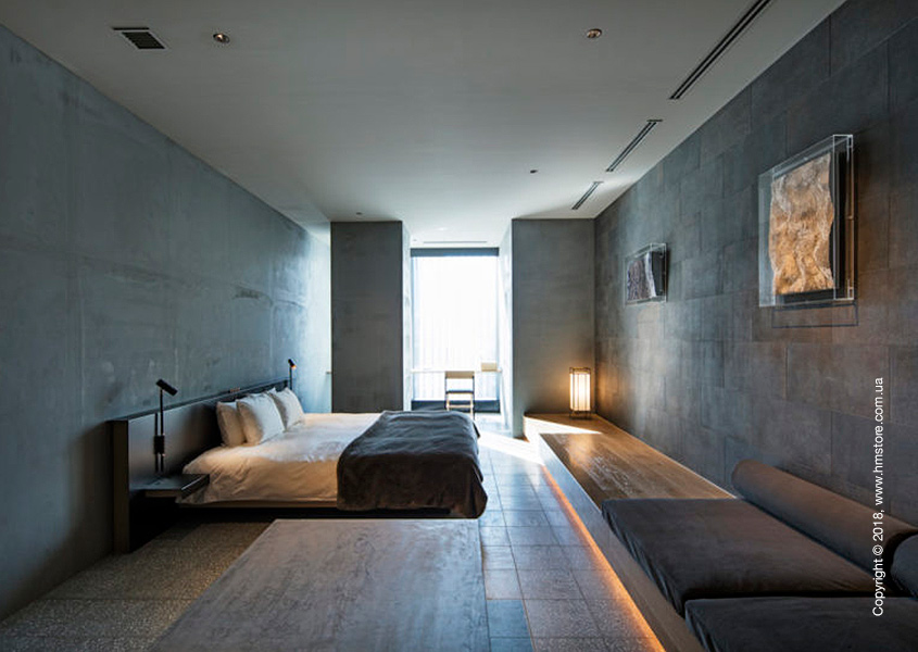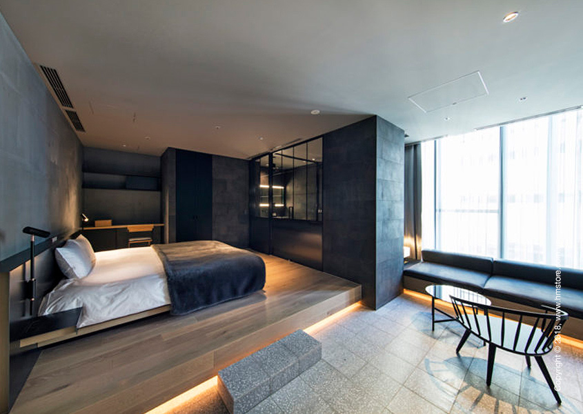 Темные оттенки серого напоминают традиционное японское искусство обугливания дерева shou-sugi ban. Такие японские элементы, как бумажные фонарики, перегородки, приподнятые или углубленные зоны придают отелю ощущение аутентичности, а приборы и мебель по последней моде добавляют ощущение современности.