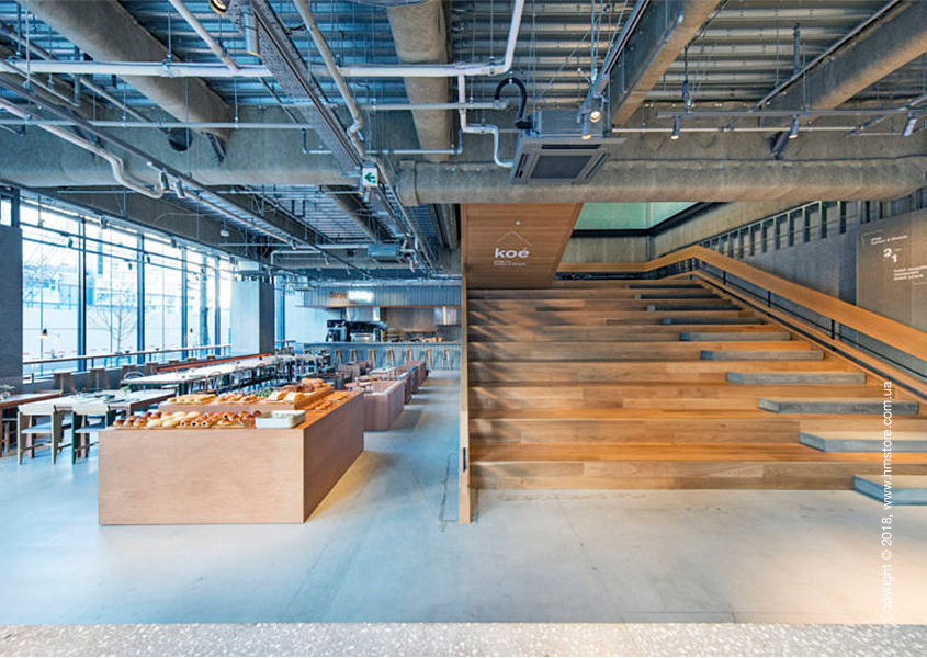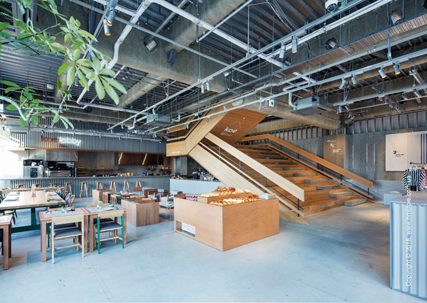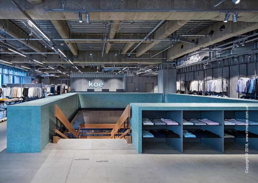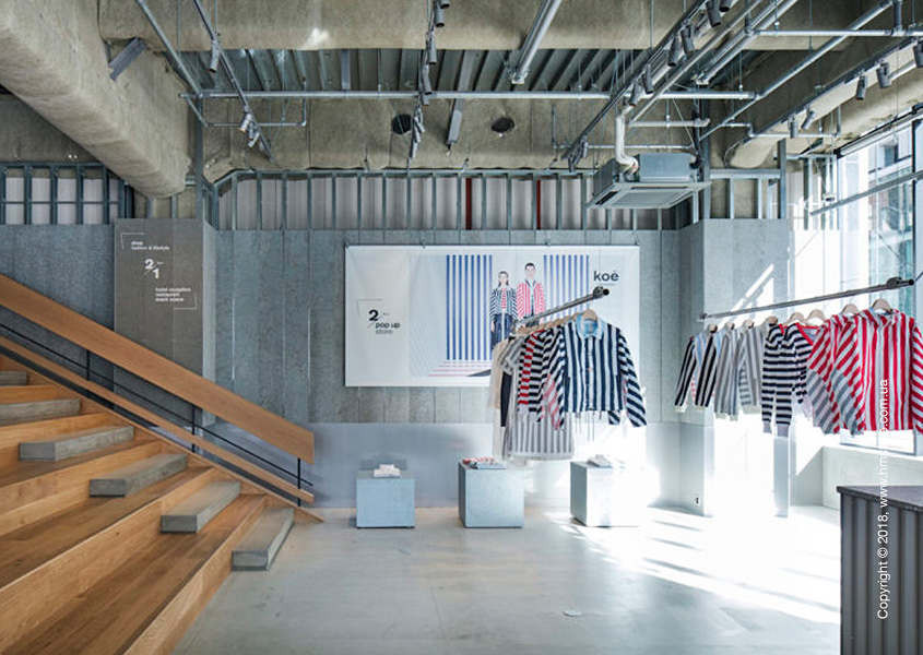 На втором этаже можно купить оригинальную одежду и аксессуары от koé, а также уникальные вещи, созданные совместно с художниками. С 21:00 до 23:00 магазин не обслуживается персоналом, но посетители могут расплачиваться карточкой на кассе самообслуживания.