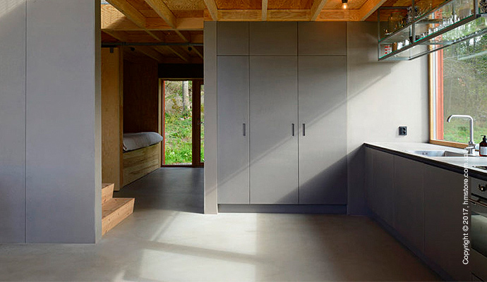В гостиной находится рабочий стол, окруженный фанерными полками для хранения. Фанера – это один из главных материалов, который можно увидеть по всему дому, включая открытые потолки, встроенную мебель, лестницу и некоторые стены. Местами поверхности покрыты темно-серыми деревянными панелями ДВП, как на кухне.