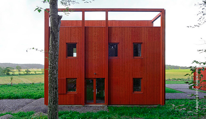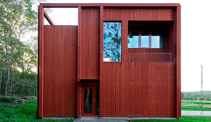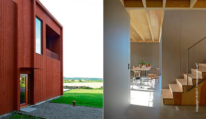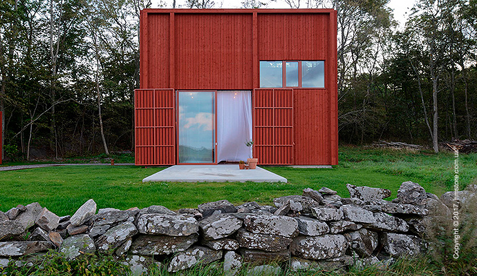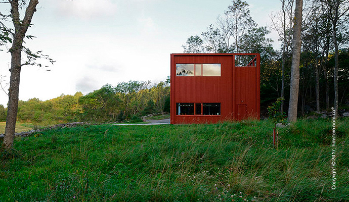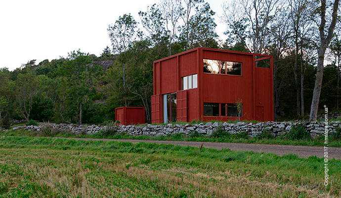 Это строение, напоминающее коробку, выглядит как современный амбар, окрашенный традиционной шведской фалунской красной краской. Огромные «гаражные» двери расположены сбоку от окна, выходящего на запад, добавляют дому деревенский стиль.