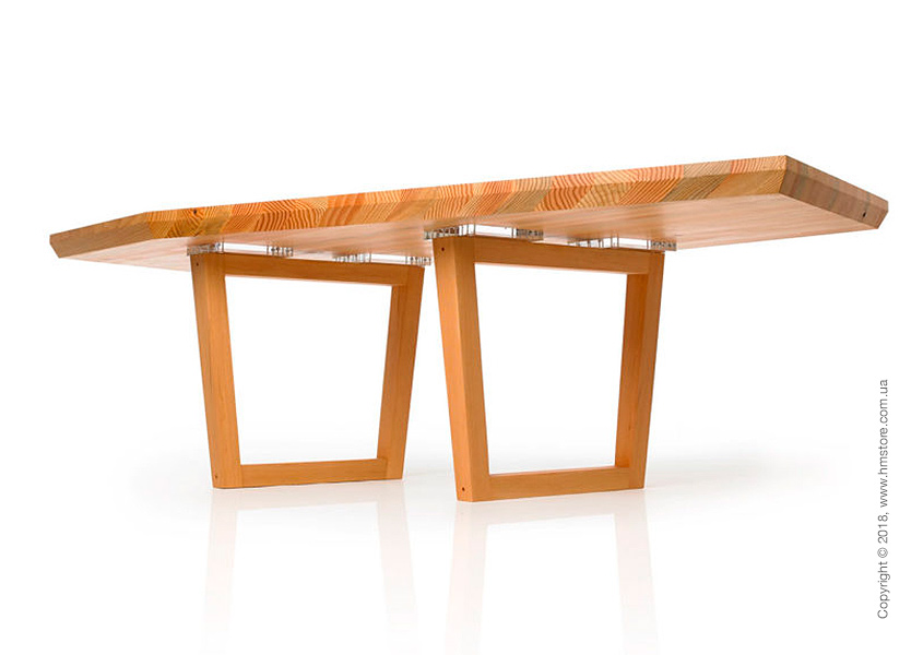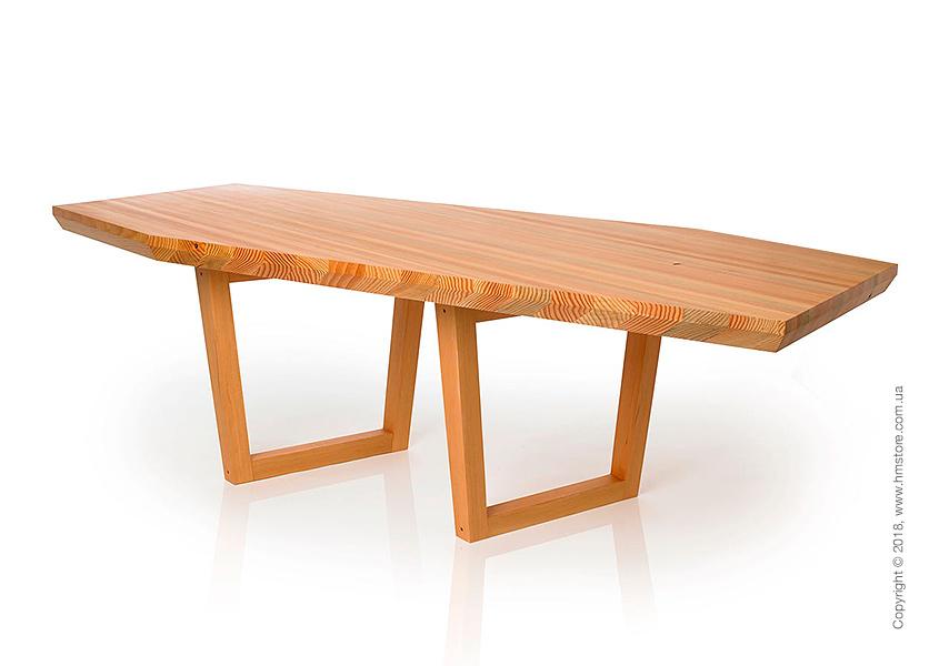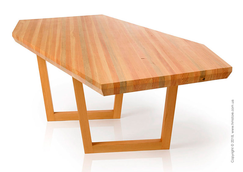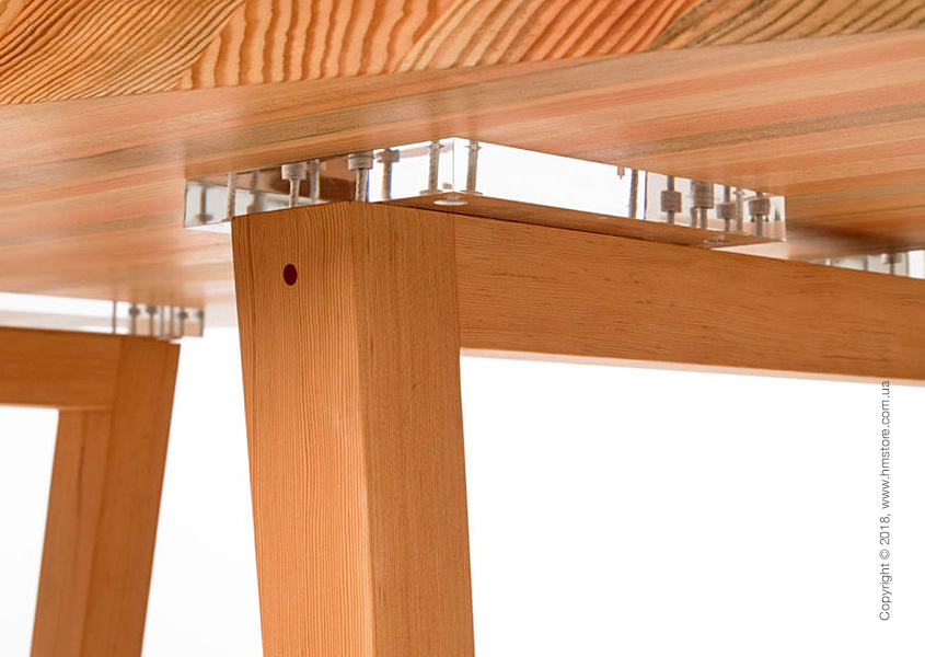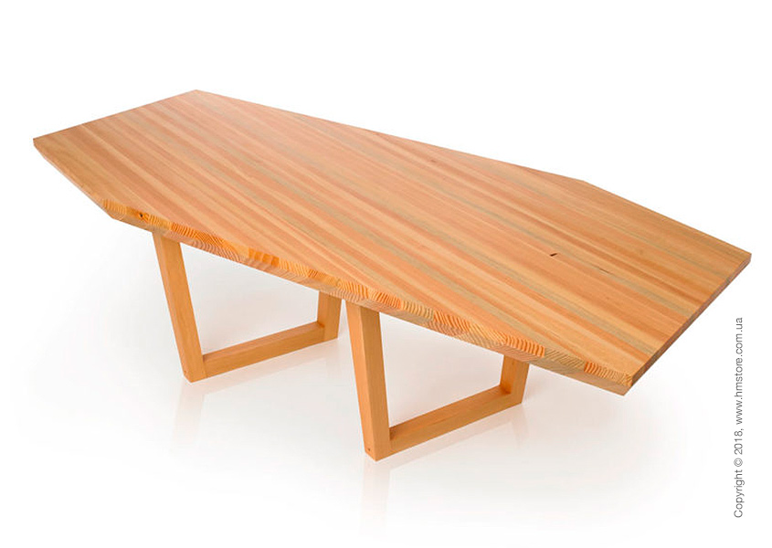 Текстура столешницы подчеркивает эти углы, а акриловые вставки под ней используются для нестандартной установки ножек. Этот стол создан из древесины дугласовой пихты, сертифицированной Лесным попечительским советом, с отделкой немецким парафиновым маслом, или древесины гигантской туи с обожженной столешницей и ножками, слегка окрашенными благодаря масляной отделке.