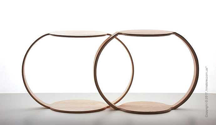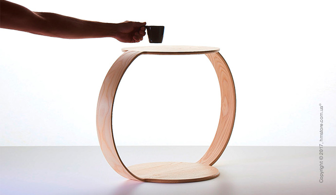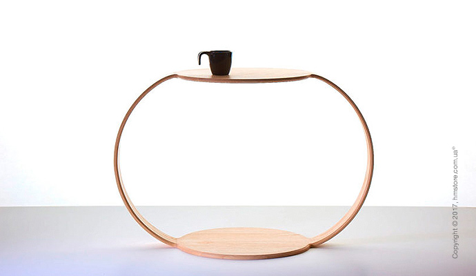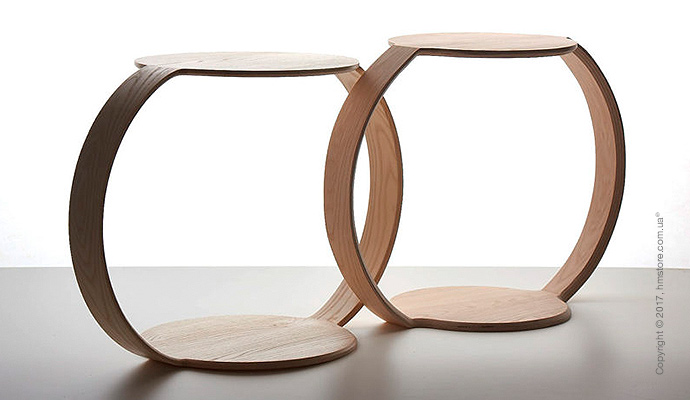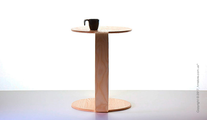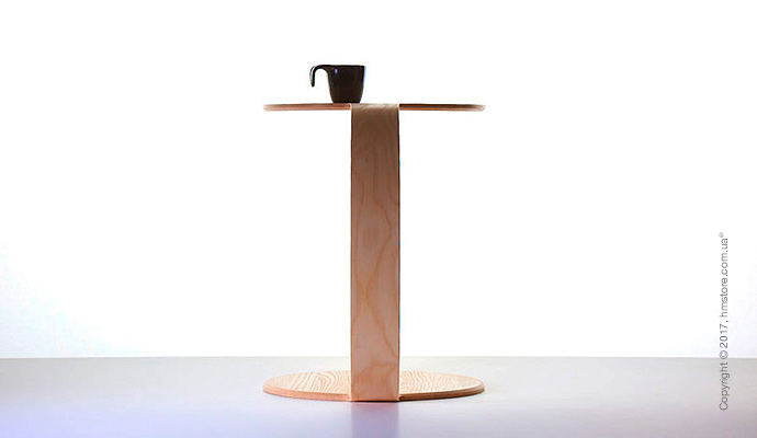 Стол сделан из прессованной ясеневой фанеры со скошенными краями, которые придают этому предмету утонченный силуэт. Круглые столешницы совпадают по форме с такой же противоположной круглой стороной, которая служит основанием для столика.