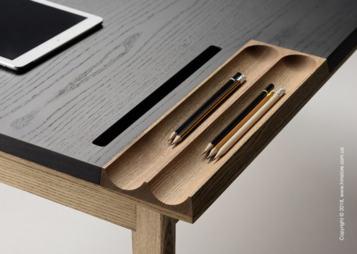 «OLLLY» (получивший награду «Red Dot Award») имеет один небольшой, компактный ящик для простого хранения. На поверхности столешницы имеется достаточно отверстий для офисных принадлежностей, а также встроенные подставки для телефонов и планшетов, что гарантирует чистоту на столе. Кроме того, специальные вырезы на дальнем краю стола позволят скрывать провода и кабели.