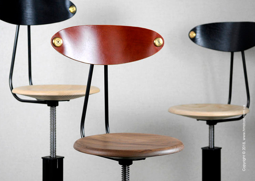 18. Architect’s Stool with Back – готовыепредметы. Сиденье из белого дуба сочетается с черной кожаной спинкой, окрашенной в черный цвет сталью и латунными деталями. Сиденье из ореховой древесины сочетается с коричневой кожаной спинкой, окрашенной в черный цвет сталью и латунными деталями.