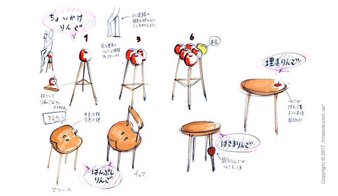 «Kimura Woodcraft Factory» создает предметы из древесины редких пород яблонь и туевика, выращиваемых в Аомори (Япония). Одной из новинок компании стал табурет «Ringo Stool» от дизайнера Такааки Камеи (Takaaki Kamei), который решил таким образом отдать дань уважения своему прадеду и тому, как он собирал яблони используя специальную лестницу.