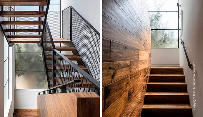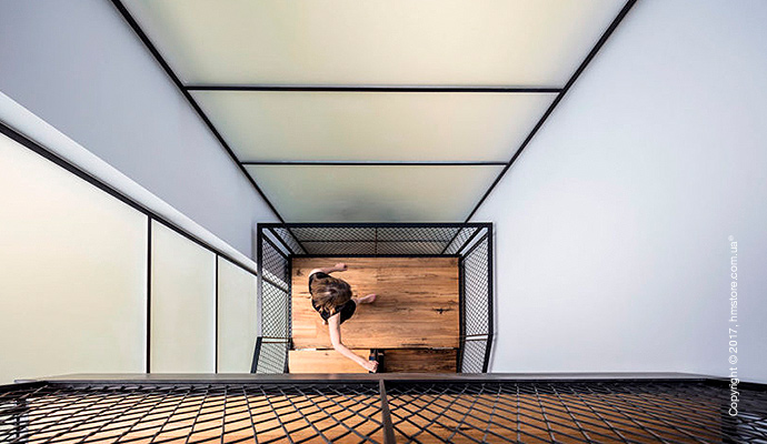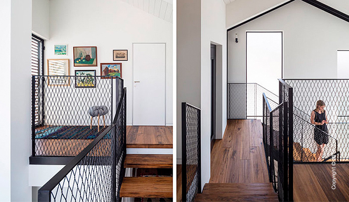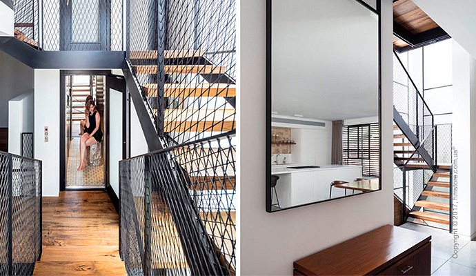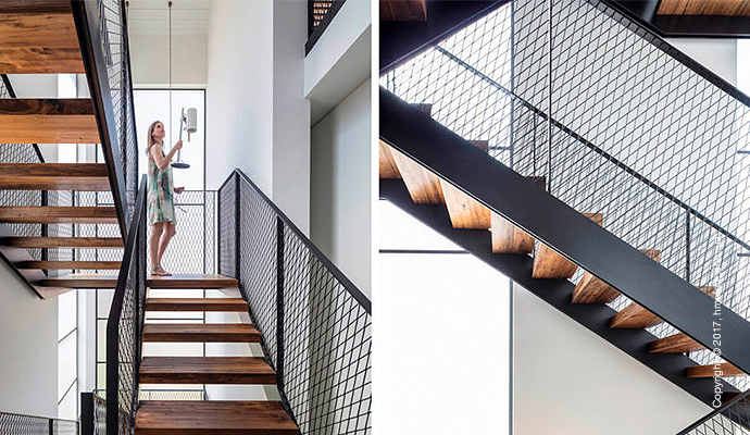 Лестничный пролет соединяет все этажи дома. Огромные окна на каждом этаже обеспечивают много натурального света, который также легко проходит через решетки ступеней.