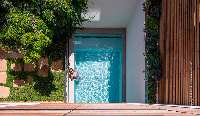 Задняя и боковые стенки дома контрастируют с фасадом – они полностью современны, поскольку их не видно со стороны улицы. Огромные двухсветные ставни, созданные под заказ, создают максимальную приватность и защиту от солнца.