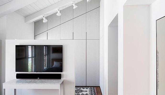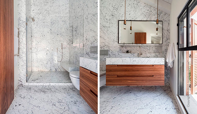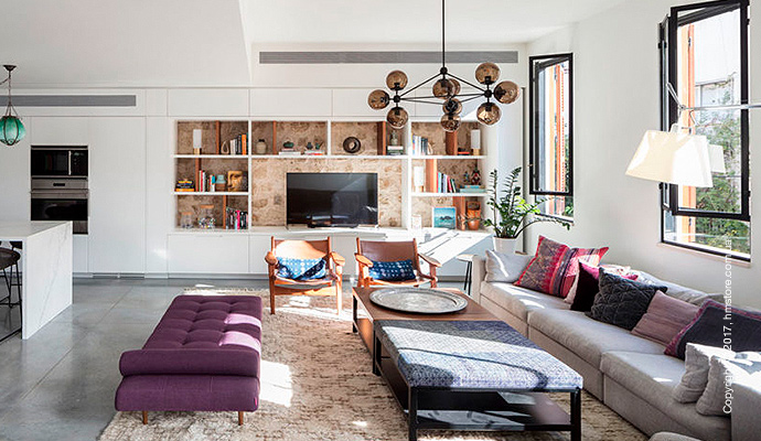 Цветовая палитра была выбрана довольно нейтральная с добавлением таких спокойных цветов, как фиолетовый и зеленый. Дизайнер интерьера Линдси Бентис (Lindsay Bentis) из «Thread Art + Design» использовала много теплой ореховой древесины и натурального камня, которые идеально сочетаются с современной мебелью.