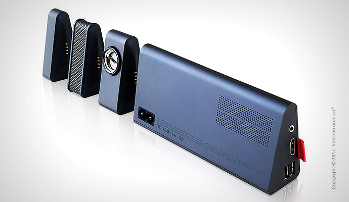 Ну, а если у вас нет внешнего монитора или проектора, «Pega» предлагает вам воспользоваться модулями, которые точно вам понадобятся. Модули проектора и колонки удобно крепятся к корпусу компьютера. Нужна подзарядка? Для этой цели также есть специальный модуль. Все эти модули крепятся к «Pega CPU» с помощью магнитов и могут быть легко отсоединены при необходимости. «Pega» оснащен выходами «mini-jack», HDMI и двумя USB-портами.