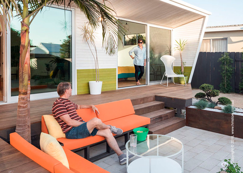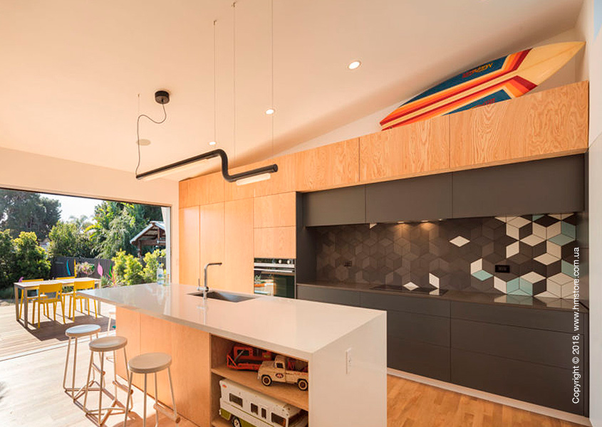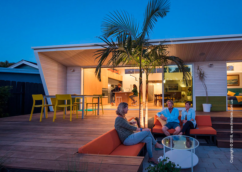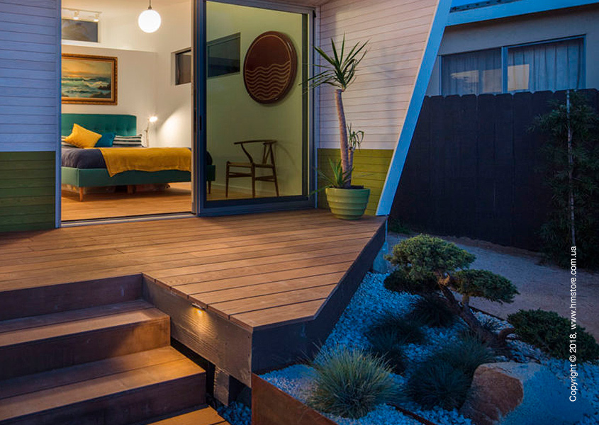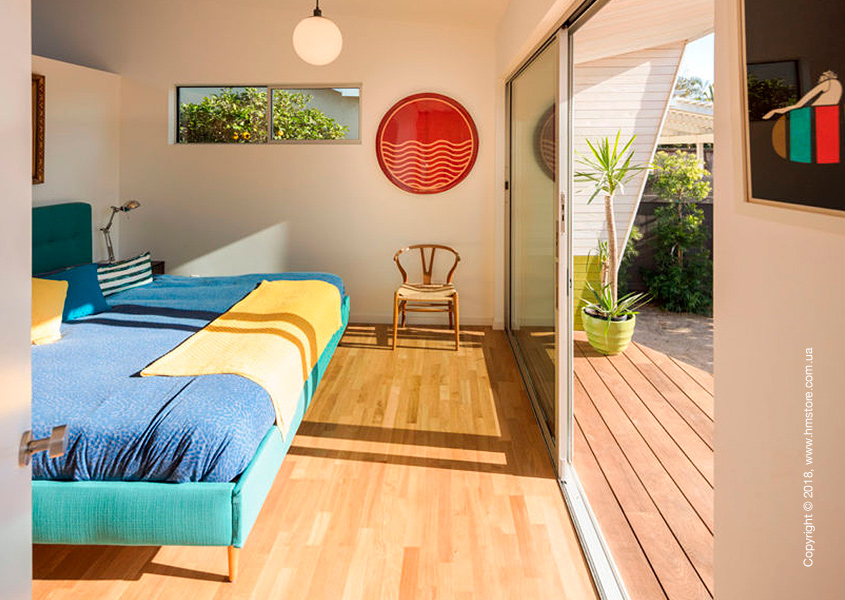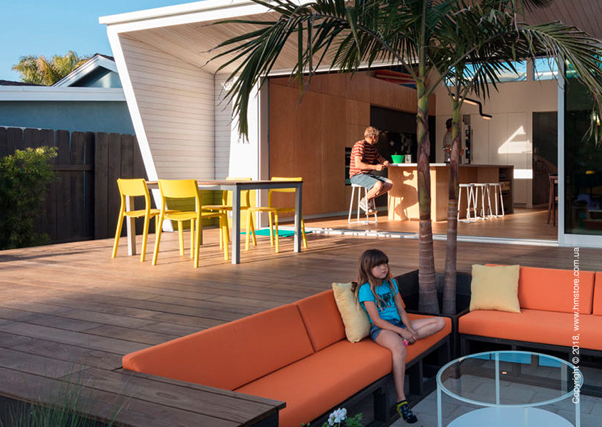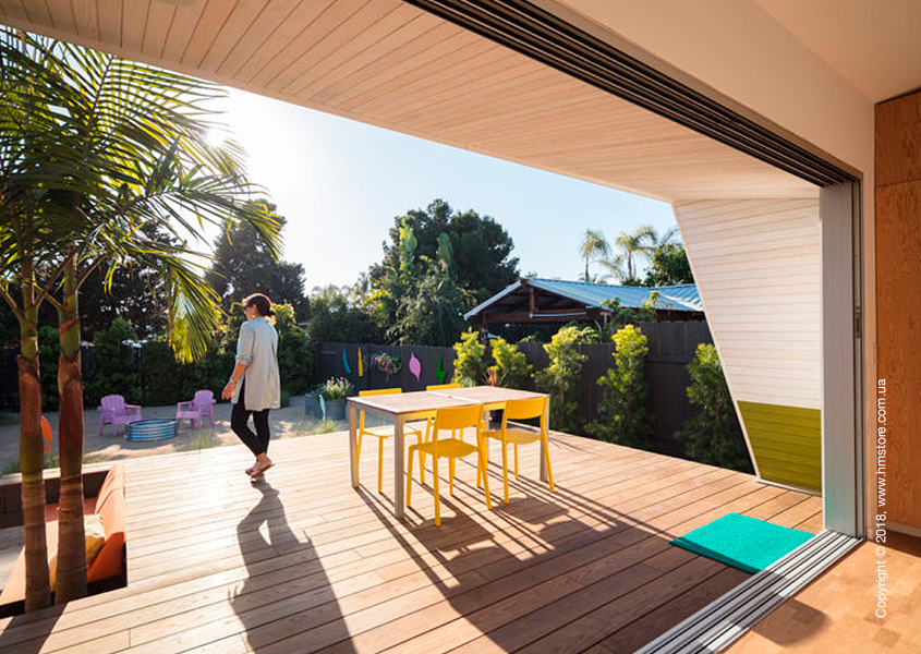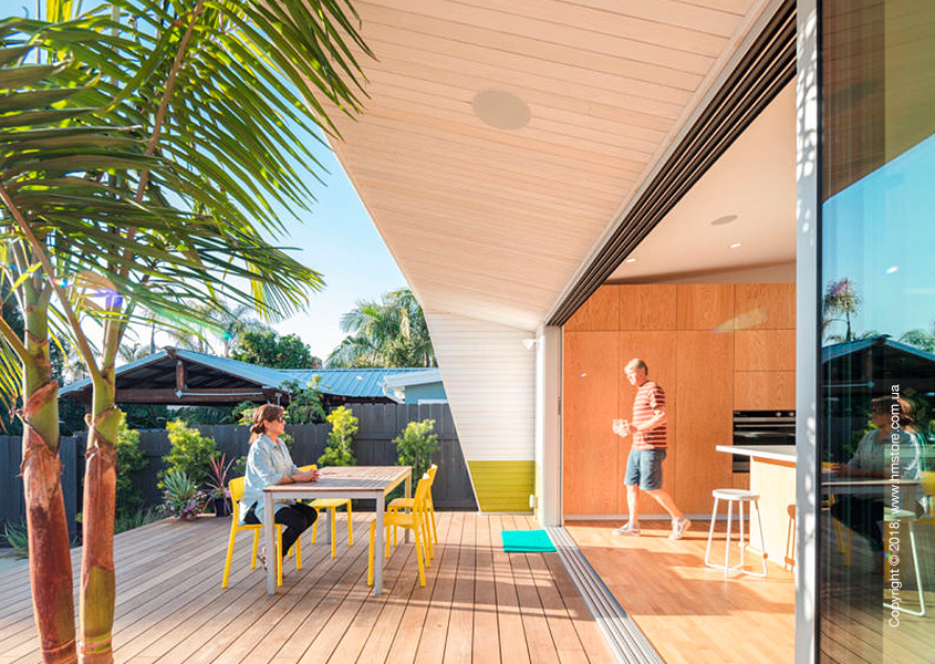 В задней части дома находится длинный навес, который обеспечивает защиту от солнца и позволяет натуральному свету поступать внутрь дома. Массивные раздвижные стеклянные двери открываются так, чтобы объединять внутреннюю гостиную и двор.