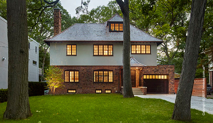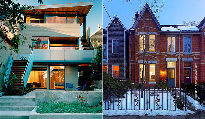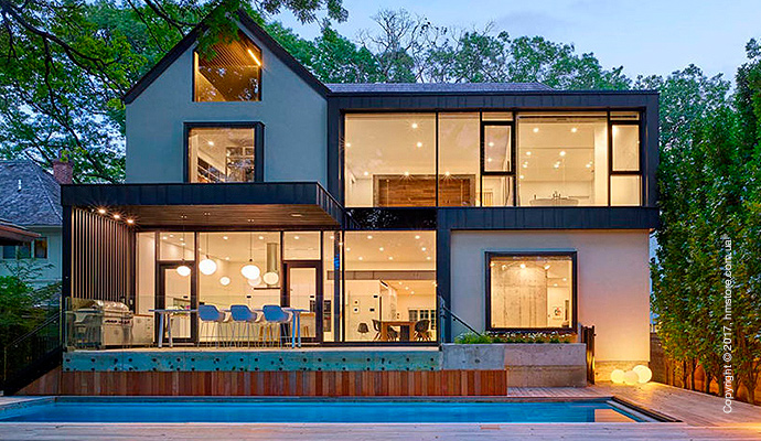 Обновление старого дома «Bilateral House», которому уже 116 лет и который расположен в Торонто, было завершено компанией «Audax». Фасад здания был тщательно реконструирован с помощью восстановленного кирпича, новой штукатурки и деревянной отделки. При этом дизайнеры создали современный интерьер и пристройку с большими окнами от пола до потолка, которые выходят на задний двор.