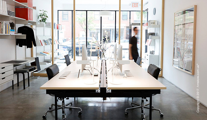 Для оформления некоторых деталей они пригласили дизайнера-архитектора Miran Jang. Например, стеклянная стена разделяет помещения. В целом интерьер отличается простотой. Для магазина и офиса использовались разнообразные полки «Vitsoe 606».