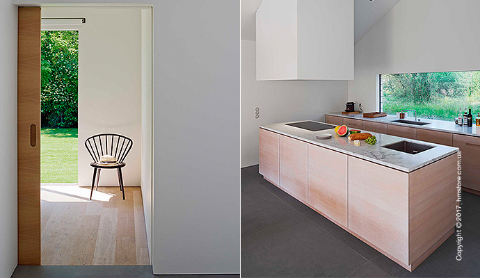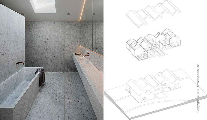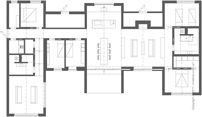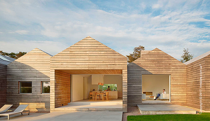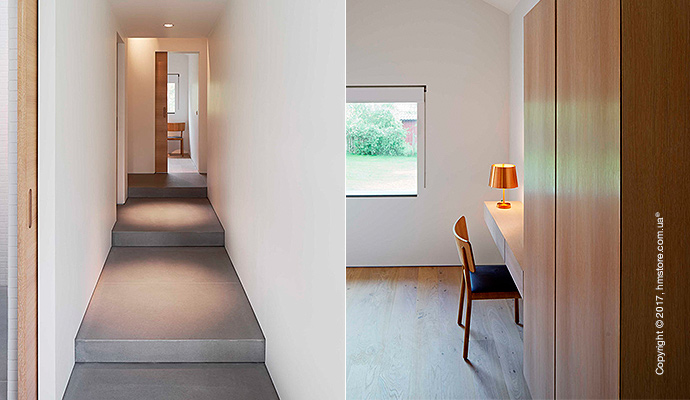 В одном конце дома находится хозяйская спальня, а в другом – детская. Между ними располагаются общие помещения. Каждый из «павильонов» имеет традиционную скатную крышу, однако, в целом, весь дом выглядит очень современно.