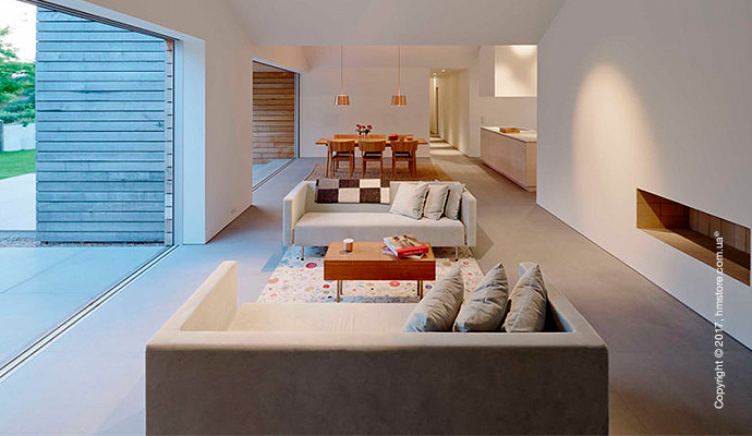 Спальня и комната отдыха расположены на нижнем уровне, что обусловлено ландшафтом. Просторные общие помещения имеют открытую планировку и имеют раздвижные окна от пола до потолка, которые прячутся в стены, убирая границу между интерьером и двором. Стены здесь, а также патио покрыты камнем «Pietra Serena».
