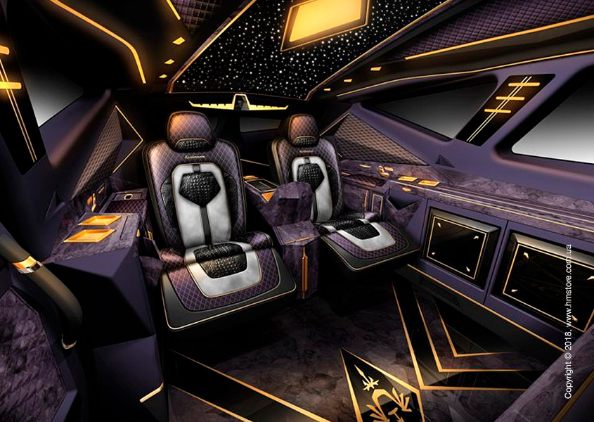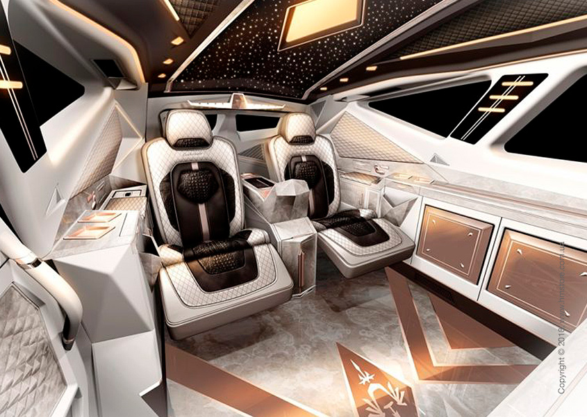 Внешнюю оригинальность может превзойти только показная отделка интерьера – роскошь здесь выводится на совершенно новый уровень: удобные кресла, индивидуальное кондиционирование, система очистки воздуха, потолок в виде звездного неба, холодильник и выбор цветовой отделки.