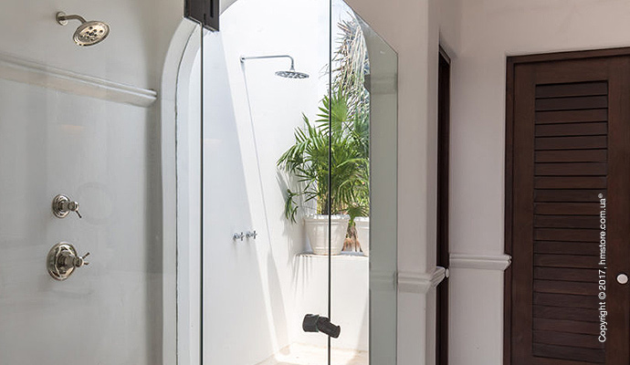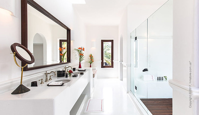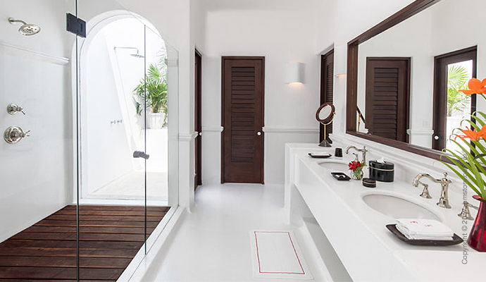 Белая тематика номеров продолжается в ванных комнатах, где вы можете выбрать душ снаружи и внутри. Деревянные акценты помогают разделить помещение, а двойная раковина позволит обоим отдыхающим собираться одновременно.