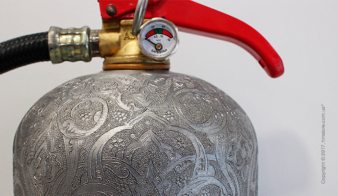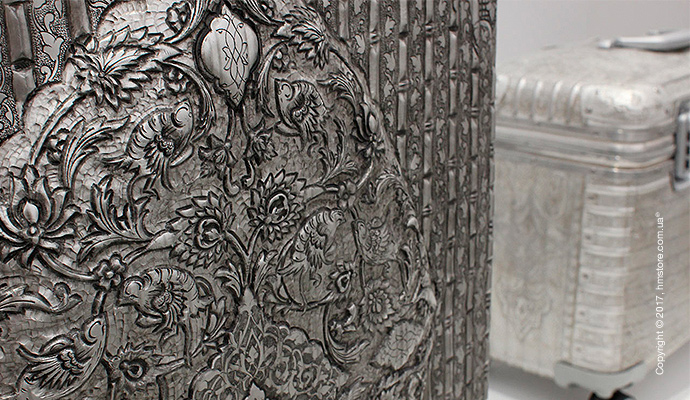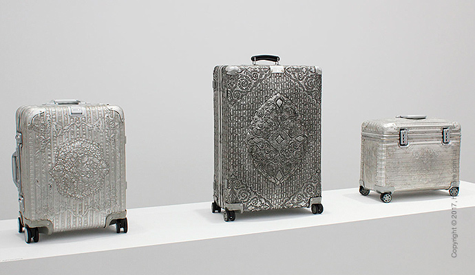 На выставке также можно было увидеть другие алюминиевые предметы с подобными орнаментами, включая набор чемоданов «Rimowa» и 2 огнетушителя.